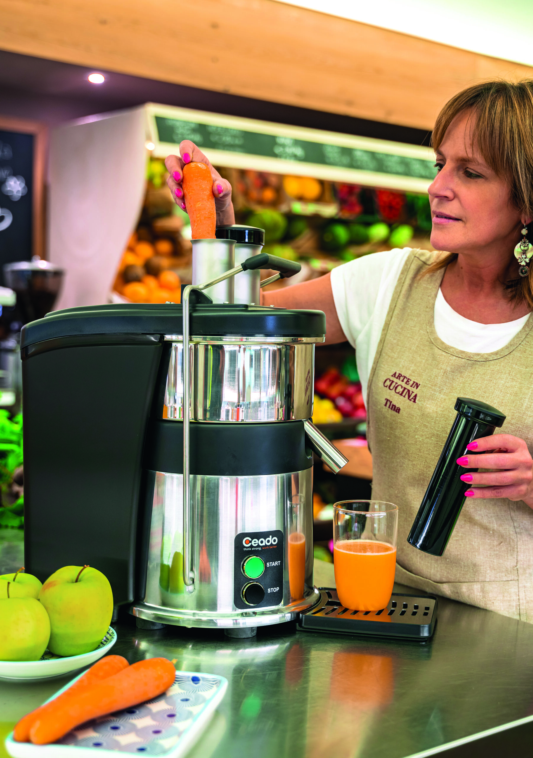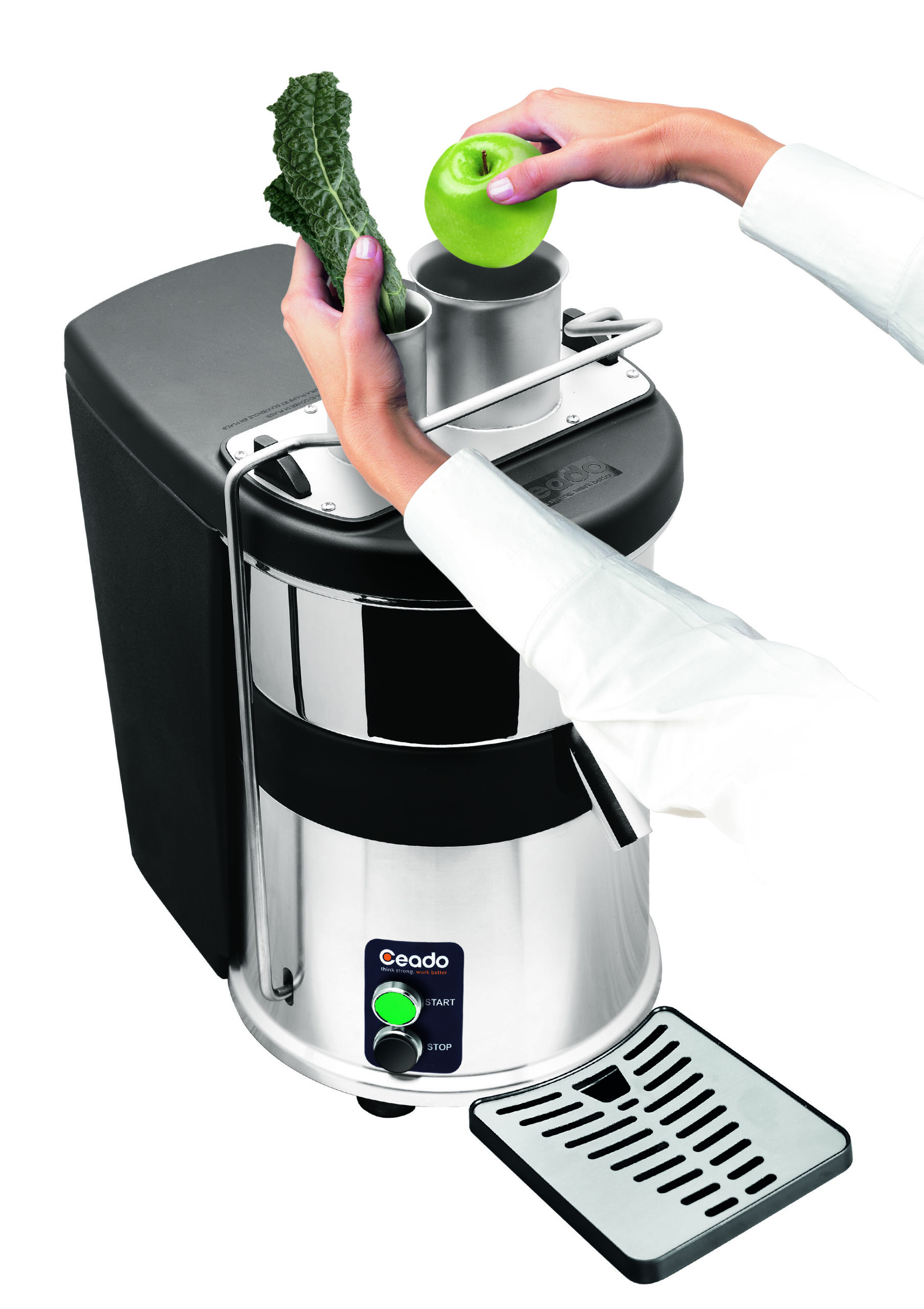 Centrifuga con espulsione automatica dei residui, l’unica sul mercato con doppio tubo di alimentazione che ottimizza l’estrazione da frutta e vegetali. 2 litri di succo in un minuto! Servizio continuo e silenziosità, l’ideale sviluppo del business per locali alto vendenti, con consumi di frutta e vegetali oltre i 10 kg al giorno.